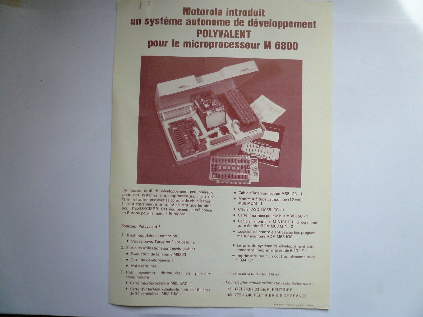 A French Advance information datasheet for the Polyvalent Development System M68AD-1 issued in 1976, with a note that the price was indicative as at 01-OCT-1976.