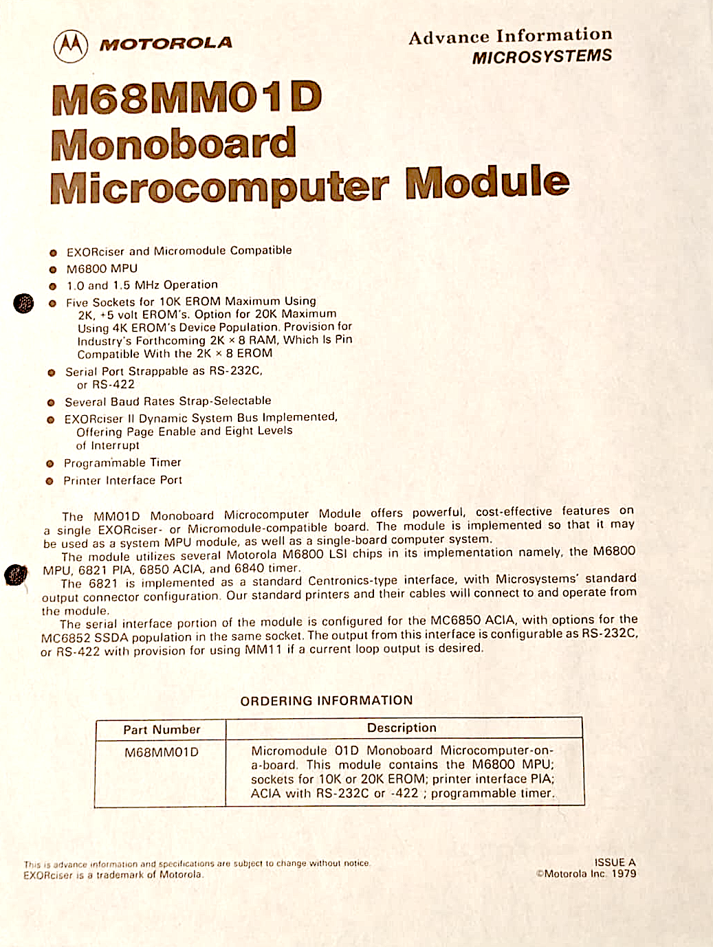 M68MM01D Monoboard Microcomputer Module Datasheet