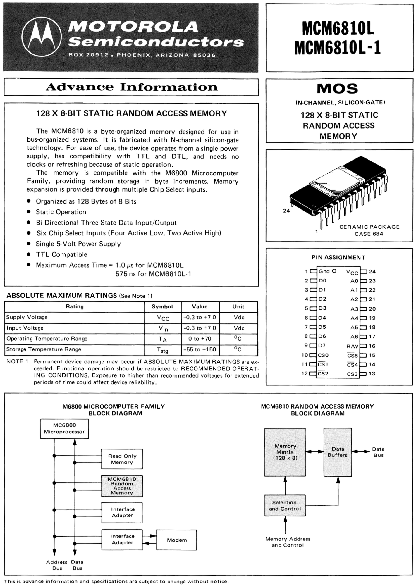 MCM6810 128 x 8-Bit Static Random Access Memory (Advance Information May 1975)ΒΆ