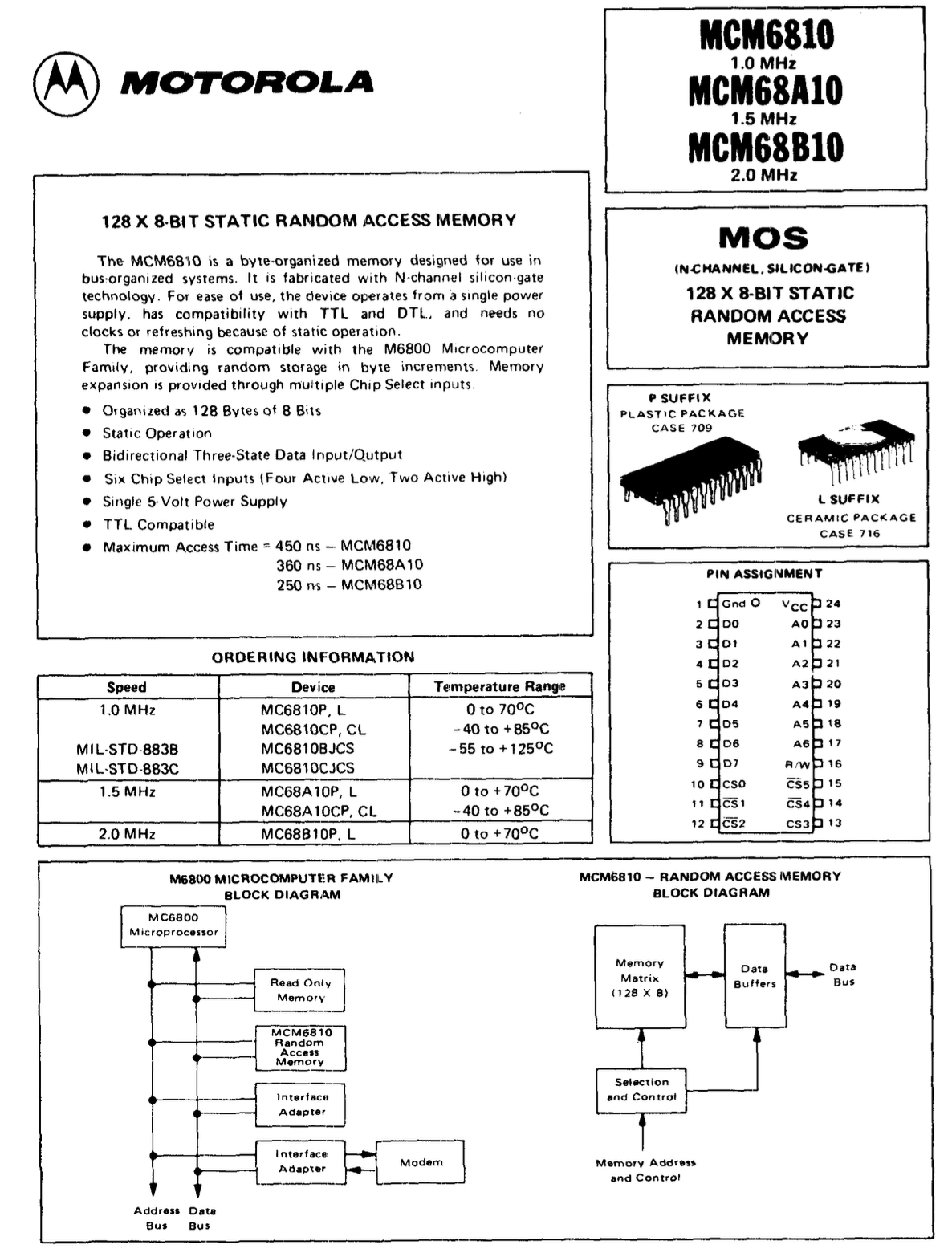 MCM6810 128 x 8-Bit Static Random Access Memory