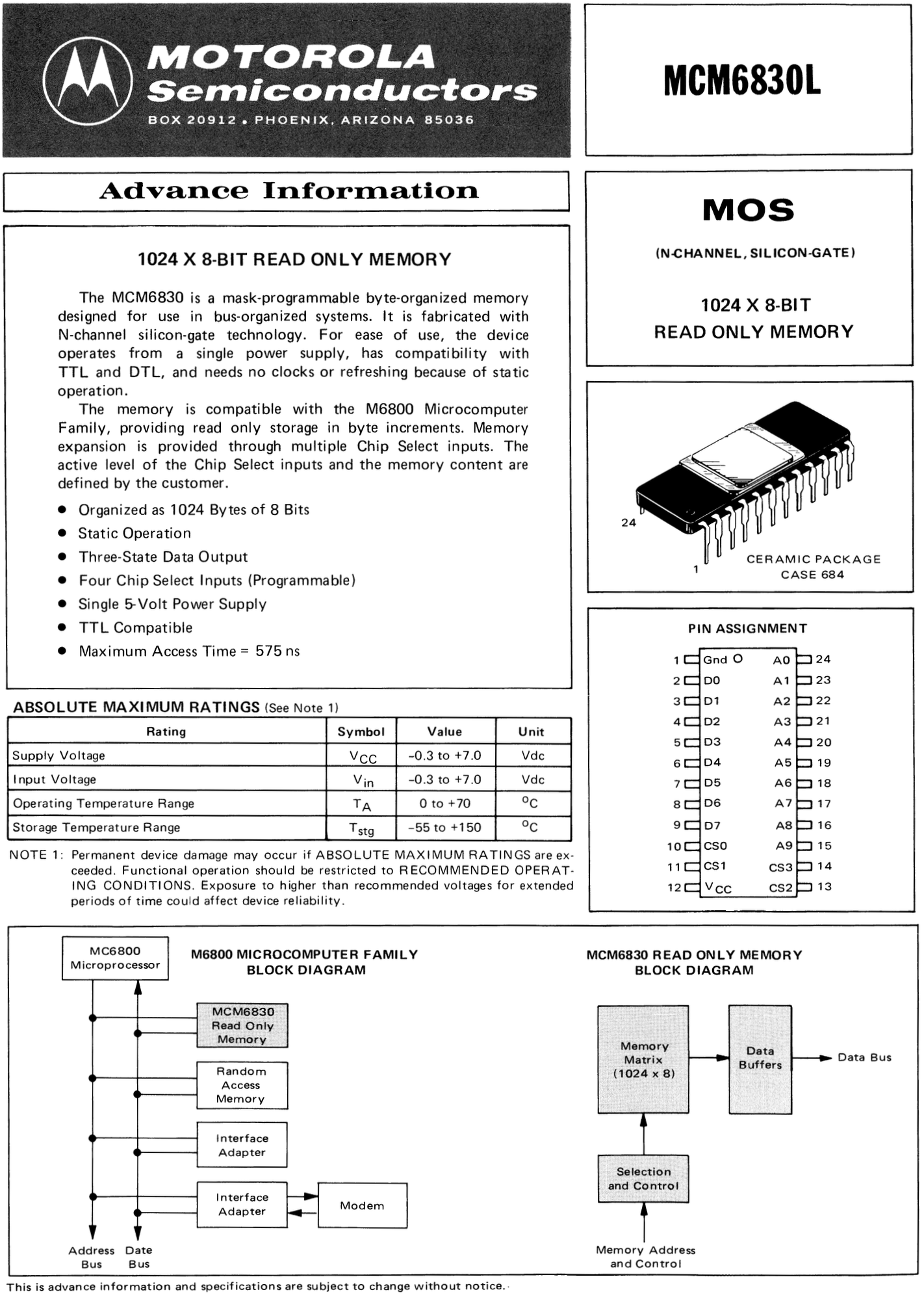 MCM6830 1024 x 8-Bit Read Only Memory (Advance Information May 1975)