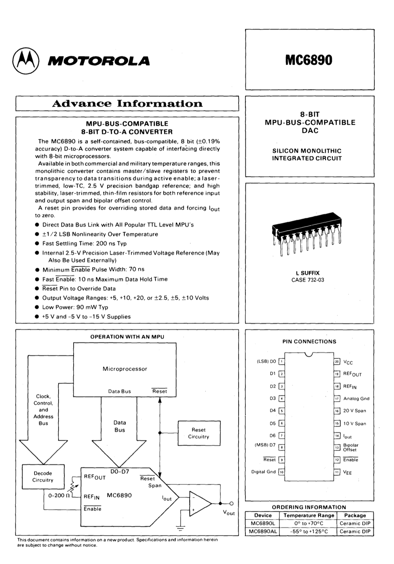 MC6890 MPU Bus-Compatible 8-Bit D-to-A Converter