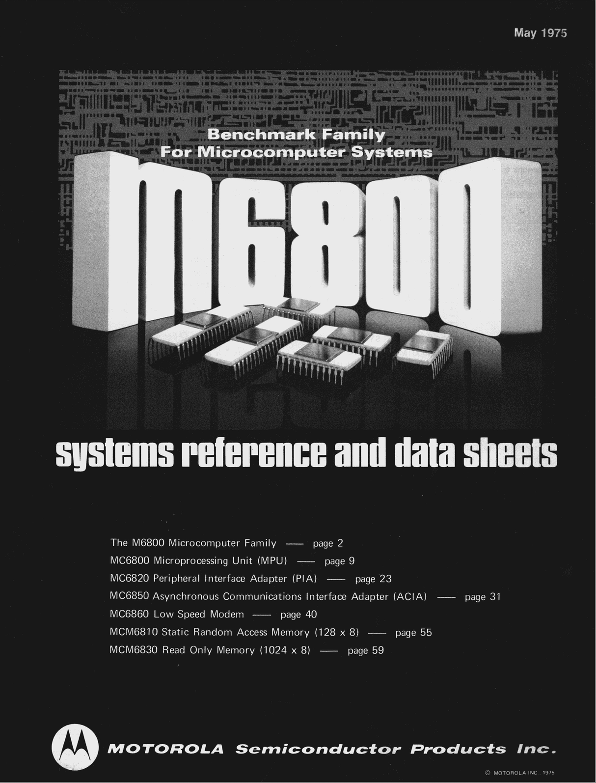 MC6800 Microprocessing Unit (MPU) May 1975 Advance InformationMC6820 Peripheral Interface Adapter (PIA) May 1975 Advance InformationMC6850 Asynchronous Communications Interface Adapter (ACIA) May 1975 Advance InformationMCM6810 Static Random Access Memory (128 x 8) May 1975 Advance InformationMCM6830 Read Only Memory (1024 x 8) May 1975 Advance Information